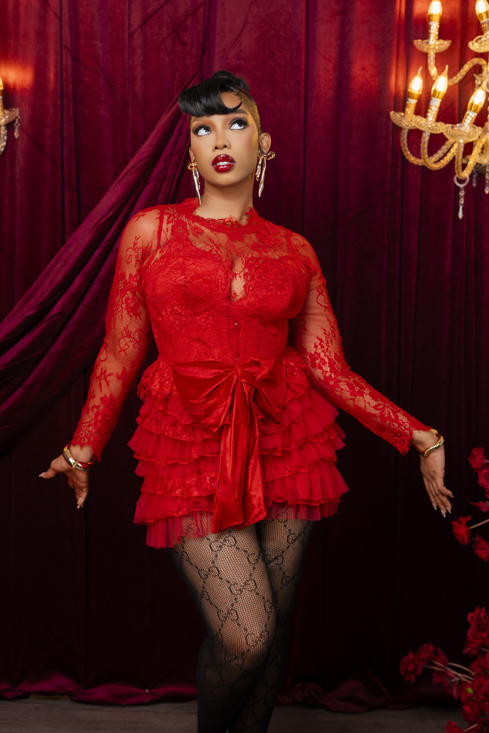 A red lace mini with sheer sleeves, a sculpted bodice, tiered ruffle skirt, and a luxe velvet bow. Elegant, bold, and made for unforgettable moments.